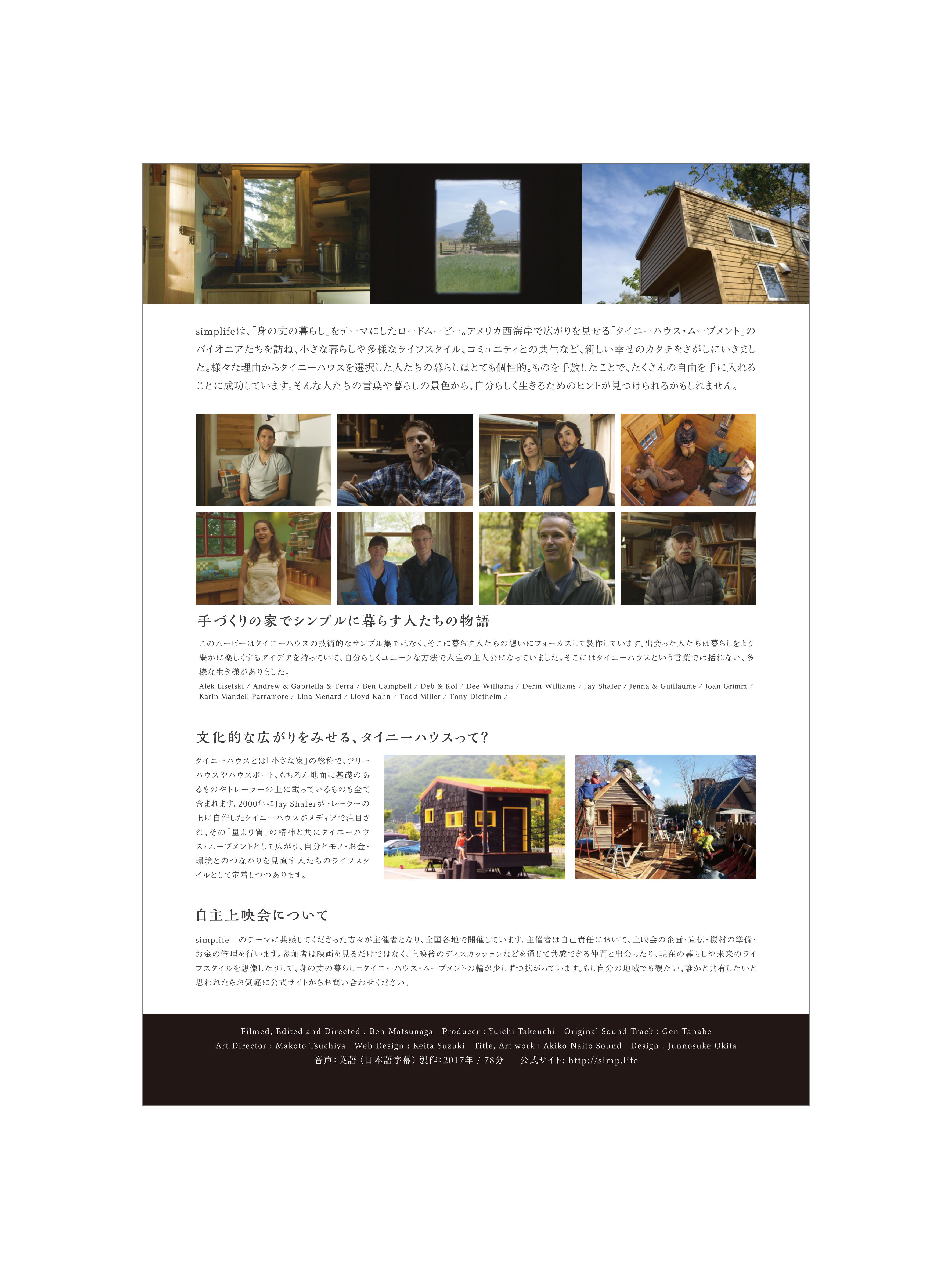 このムービーはタイニーハウスの技術的なサンプル集ではなく、そこに暮らす人たちの想いにフォーカスして製作しています。出会った人たちは暮らしをより豊かに楽しくするアイデアを持っていて、自分らしくユニークな方法で人生の主人公になっていました。そこにはタイニーハウスという言葉では括れない、多様な生き様がありました。
