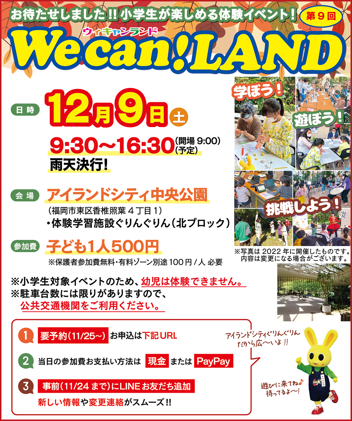 ◆参加費:参加小学生1名 500円(税込)同伴保護者は参加費無料
